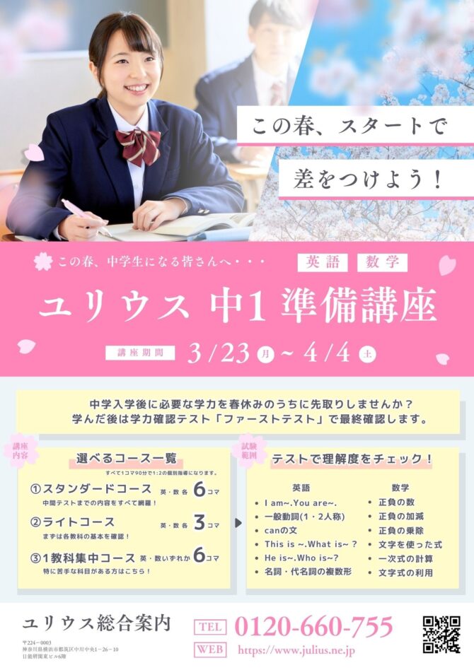 ユリウスから「中1準備講座」のご案内です。
