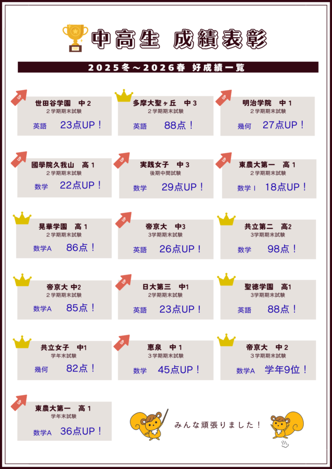 中高生好成績・成績向上一覧