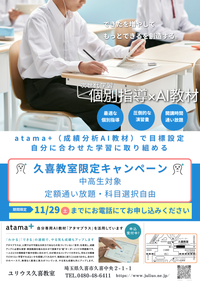 ユリウス久喜教室では個別指導とAI教材atama+のハイブリッド指導で高校受験合格を目指す「高校受験コース」を設置しています。