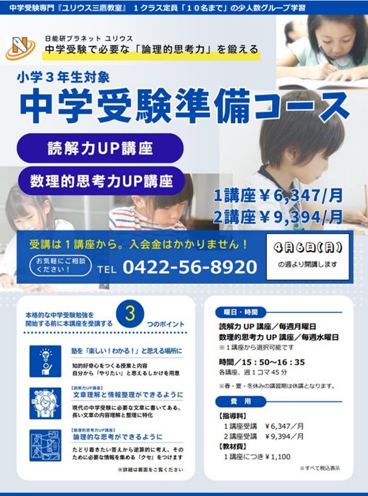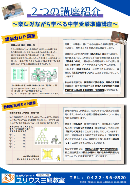 「読解力アップ講座」「数理的思考力講座」の2講座からなる、中学受験準備講座です。